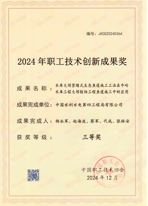 近日,2024年中國技協職工技術創新成果評選結果揭曉,由第一分局牛嶺水庫項目的“水庫大壩豎縫式生態魚道施工工法在牛嶺水庫工程大壩樞紐工程魚道施工中的應用”榮獲2024年中國技協職工技術創新成果三等獎。 該創新成果的應用是基于生態魚道的施工技術,通過應用一體式模具、豎縫誘導魚道、國內最高回轉魚塔及排水管改造的魚道等技術措施,解決了魚道混凝土的外觀質量、魚類洄游難度、魚道的使用率低等問題,加快了施工進度,同時節約了成本。實踐表明該課題的研究在牛嶺水庫工程魚道工程施工中的運用是成功的,其工藝成熟,操作方便、快捷,適應性強,所應用的一體式模具對技術革新有積極推動作用,為今后魚道工程及類似魚道工程施工提供有益的經驗借鑒,具有廣闊的工程推廣應用前景。 該創新成果在魚道外觀質量提升、魚道施工技術、魚道設計優化等多個關鍵技術領域取得了重大突破,榮獲國家發明專利1件、實用新型專利4件、省部級工法1項、中國水利協會工法1項、工程建造微創新技術大賽優勝成果1項、省級質量信得過班組1項。 |